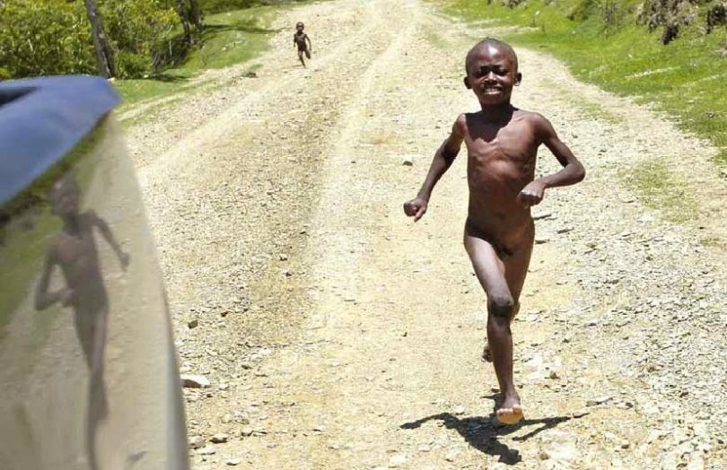 En esta foto se percibe que los niños, en la frontera de República Dominicana y Haití, en la llamada carretera internacional, se juegan la vida para pedir a los visitantes comida o cualquier dadiva; y en su desesperación, los menores corren kilómetros descalzos persiguiendo los vehículos de los visitantes.