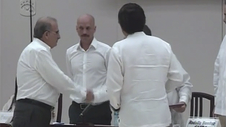 El acto fue protagonizado por los jefes negociadores de ambas partes, Humberto de la Calle por parte del Gobierno colombiano y Luciano Marín Arango (alias Iván Márquez) por las FARC. Ambos firmaron un documento que concluye el debate del quinto punto de la agenda, de un total de seis, y que incluye verdad, justicia, reparación y garantías de no repetición.