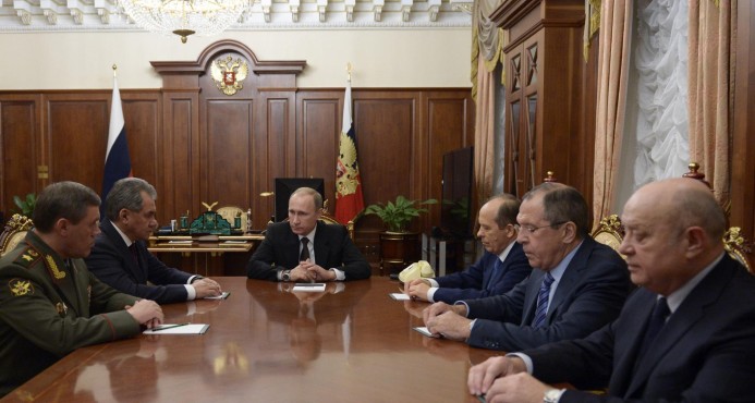 Vladimir Putin con los jefes militares y funcionarios de su gobierno