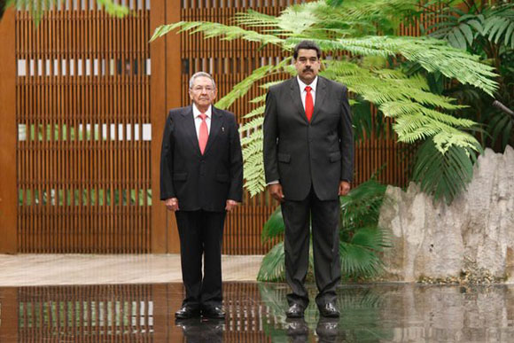 Suenan otra vez los Himnos Nacionales de Cuba y Venezuela. El presidente de los Consejos de Estado y de Ministros, General de Ejército Raúl Castro Ruz, se prepara para el recibimiento oficial del presidente de la República Bolivariana de Venezuela, Nicolás Maduro Moro.