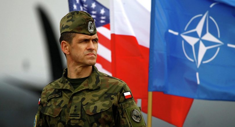 Soldado polaco cerca de la bandera de Polonia y la OTAN