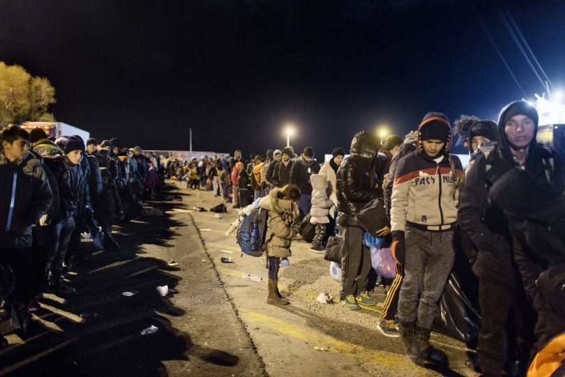 Refugiados y migrantes esperan para abordar un ferry que los lleve a Atenas en el Puerto de Mitilene en Lesbos.