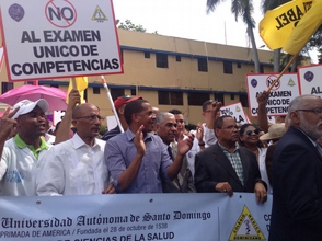La marcha la encabezan el presidente del Colegio Médico Dominicano (CMD), Waldo Ariel Suero, y el decano de la Facultad de Medicina de la UASD, Wilson Mejía, quienes advierten que no permitirán que se elimine la Pasantía de Ley, que es el objetivo del examen único.