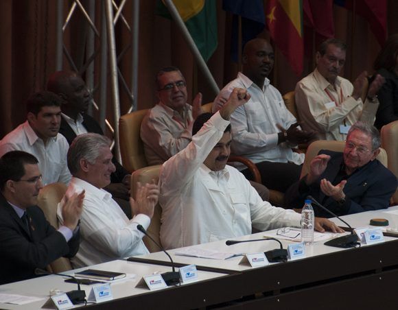 El mandatario sudamericano tomó la palabra antes de cerrar el evento y realizó un recuento histórico de cómo surgió la Revolución Bolivariana, recordó el primer encuentro entre Hugo Chávez y Fidel Castro hace 23 años, el surgimiento del ALBA y el enfrentamiento al Área de Libre Comercio de las Américas (ALCA).