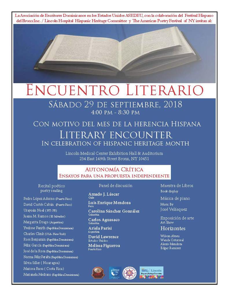 La Asociación de Escritores Dominicanos en los Estrados Unidos (ASEDEU), en colaboración con varias organizaciones culturales, invita a su I Encuentro Literario con ocasión de celebrarse en los Estados Unidos de América el «Mes de la Herencia Hispana».