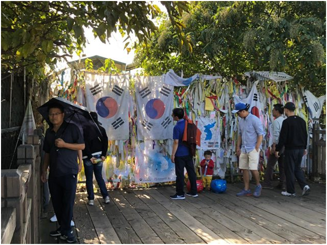 Es extraño. Cuando uno se acerca desde el sur a la Zona Desmilitarizada que divide Corea en dos partes pueden verse multitud de banderas y emotivos eslóganes sobre la “paz”, pero nada que represente el punto de vista de los norcoreanos. Todas las banderas son de la República de Corea (RC), modo oficial de nombrar a Corea del Sur.