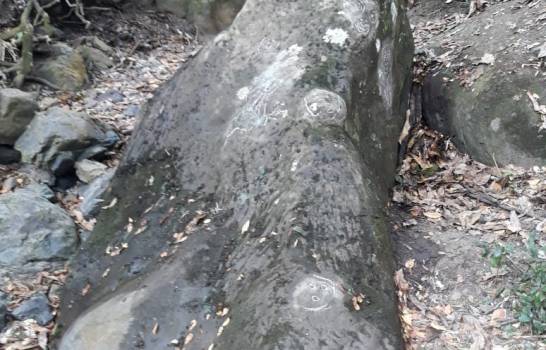 Aquí, en un tramo ahora seco de su lecho, hallamos una piedra de regular tamaño, desconocida por la mayoría de lugareños, pero de una gran importancia por los relevantes petroglifos en su superficie. En una de sus caras laterales aparece una figura antropomorfa, masculina como lo delatan sus testículos, en cuclillas y con los brazos sobre sus piernas. Las que parecen ser lágrimas que brotan de sus ojos nos llevan a pensar que se trata de una representación de Boinayel, uno de los once dioses del Turei taíno, hijo o descendiente espiritual de la serpiente parda, que sube al cielo a depositar el agua en las nubes, y antagónico de Márohu, el buen tiempo. En la cara superior, otra figura antropomorfa con los brazos sobre la cabeza y también con las piernas flexionadas parecería ser Atabey, la Madre de las Aguas, deidad femenina fundamental por su relación con el agua, y madre de Yucahú Baguá Maórocoti, el más importante de los dioses taínos, señor de la yuca y el mar, y de Corocote, últimos estos que bien podrían ser los representados en otra de las caras de la roca, acompañados de una tercera figura antropomorfa. ¿O será la figura femenina Itiba Cahubaba y ellos sus hijos, los gemelos míticos que fueron responsables directos de la creación del mar y los peces al romper la calabaza donde se conservaban los restos de Yayael, el hijo del dios supremo Yaya? Dentro del conjunto sobresalen además dos rostros con los ojos y bocas remarcados – ¿máscaras rituales, Macocael? Los que aparecen acompañados de siete petroglifos más simples, “caritas” con los ojos y bocas definidos a partir de surcos y honduras en la roca.