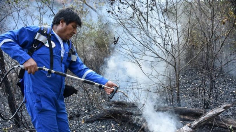 El presidente boliviano ha preferido dejar la campaña presidencial para abocarse completamente a los trabajos de control del fuego en los bosques secos de la Chiquitanía. Este martes viajó hasta la región central de la zona  y se unió a los grupos de profesionales y voluntarios que realizan las tareas de mitigar el fuego. Morales, en compañía del ministro Juan Ramón Quintana, tomó el uniforme y las herramientas contra incendio, se adentró a las zonas afectadas de la comunidad de Santa Rosa y actuó personalmente.