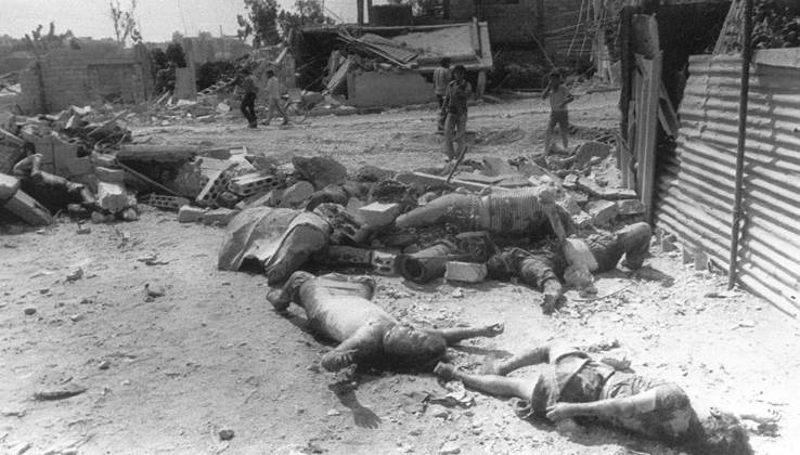 – 15 de septiembre: una turba de 150 hombres falangistas (con un historial lleno de de atrocidades contra los palestinos), equipados con machetes, armas de fuego y tanques asaltan Sabra Y Chatila atacando a miles de niños, ancianos, mujeres y discapacitados, “vengando el asesinato de su líder”, afirman. Durante tres interminables días, estas fuerzas fascistas despojadas de piedad, de compasión, de empatía, con una brutalidad inusitada, golpearon, torturaron, mutilaron y violaron a las mujeres antes de matarlas, mientras Ariel Sharon, al mando del ejército israelí (que irónicamente lleva el nombre de Tsahal «ejército defensivo», para confirmar el dicho “dime de qué presumes, y te diré de qué careces), rodeaba con tanques el campo de refugiados palestinos de Chatila y el vecino barrio de Sabra en Beirut Occidental, cerrando las salidas para impedir la huida de aquella gente aterrorizada.