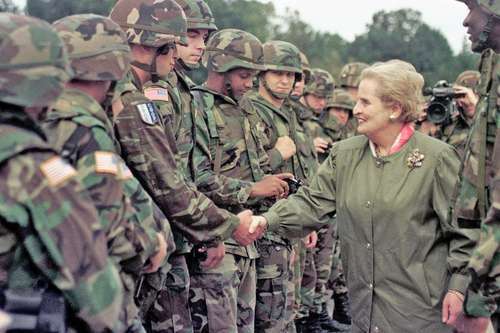 El fallecimiento de Madeleine Albright, primera mujer titular del Departamento de Estado, la semana pasada, provocó elogios nostálgicos de EE.UU. y su misión como «líder del mundo libre». Casi nadie en los circuitos oficiales recordó que, en 1996, en entrevista con CBS News, justificó la muerte de medio millón de niños a causa de las sanciones estadounidenses a Irak al declarar que «el costo valía la pena». La imagen es de agosto de 1998 durante una visita a soldados desplegados en Bosnia. (AP)