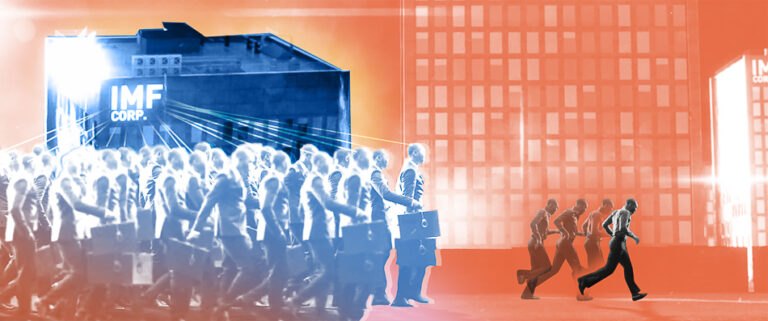 Hace diez años, el músico nigeriano Seun Kuti publicó una canción titulada “IMF” en su álbum A Long Way to the Beginning. La canción es una crítica condenatoria de la política del FMI, y el video, dirigido por Jerome Bernard, desarrolla esa crítica a través del personaje de un empresario africano sobornado y, en última instancia, convertido en zombi. Cuando el rey Midas tocaba objetos, estos se convertían en oro. Cuando el FMI toca a las personas, estas se convierten en zombis. El arte de nuestro dossier se basa en imágenes del vídeo musical de Seun, algunas de las cuales se reproducen en este boletín. La canción es hipnótica: