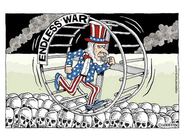 Si queremos sobrevivir, tenemos que poner fin a las guerras eternas de los Estados Unidos. Una guerra defensiva tiene razones, pero las constantes guerras de agresión de Estados Unidos benefician a corporaciones de la guerra, a las fuerzas armadas y todos sus contratistas, a los grupos de presión para la guerra y la prensa corporativa, e incluso a varias universidades. Estas guerras involucran al gobierno federal y sus instituciones gubernamentales y alimenta una economía de guerra para los mercaderes del crimen que causa destrucción y muerte a millones de personas en el mundo. La economía de guerra que domina en Estados Unidos ha limitado las posibilidades de una economía de paz, y acarreado el empobrecimiento de los estadounidenses causando decadencia social. Peor, las guerras eternas de Estados Unidos se expanden para incluir grupos corporativos de inversión, los más grandes del mundo, para que ganen dinero destruyendo y reconstruyendo países que la guerra destruye, lo que privatiza directamente países enteros.