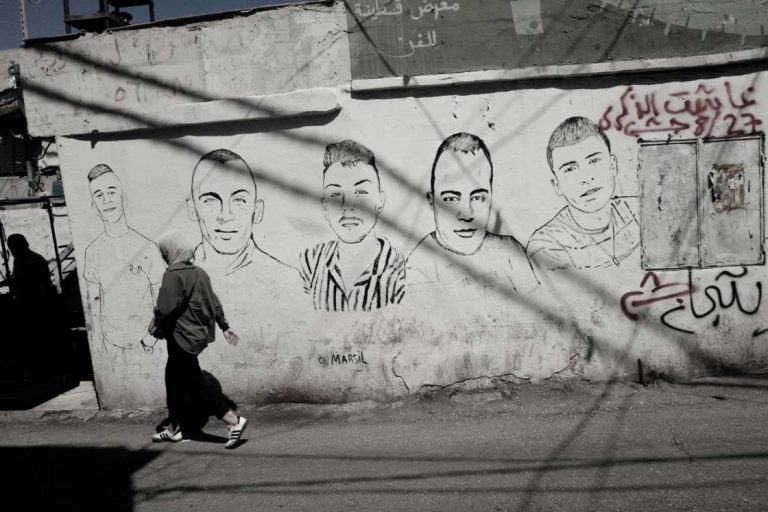 Lo que nos encontramos no difiere demasiado de la imagen que debían de tener las víctimas del Holocausto en los campos de concentración. A una decena de metros de la tumba de Abdelhamid se alza el muro que separa Jerusalén del campamento de Aida –donde Azhar, nació y creció como refugiada–, y de toda Cisjordania. En lo alto, desde las torres de vigilancia, los soldados israelíes apuntan a sus habitantes en todo momento. Por la noche, unos grandes focos alumbran el cementerio y los grafitis que recuerdan a las decenas de niños que han sido asesinados en estas calles cuando desafiaban con piedras a uno de los ejércitos más poderosos del mundo.