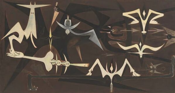 A medida que avanzaba por las salas de la exposición y más artistas de América Latina, el Caribe y los Estados Unidos, un país racialmente segregado, se unían al coro visual, quedó claro que esta voluntad de mirar lo monstruoso era también la razón por la que el surrealismo se extendió tan fácilmente a partes del mundo devastadas por la violencia estatal e imperial. En Rumblings of the Earth (1950), el artista cubano Wifredo Lam se inspiró en el Guernica de Picasso para capturar el sufrimiento que España infligió a sus colonias, mucho antes de que ese horror regresara a casa durante la Guerra Civil Española. Repleta de partes de cuerpos humanos y no humanos afiladas en forma de cuchillas, hachas y amuletos, la pintura es descrita por el curador Zach Ngin como «una representación visual del «terrible efecto boomerang» de Aimé Césaire». Observa: «La víctima de Guernica, el caballo, es sustituida en Rumblings por lo que Lam describió como un «pájaro diabólico» que lanza cuchillos y flechas. La perpleja víctima del fascismo se revela también como perpetradora».